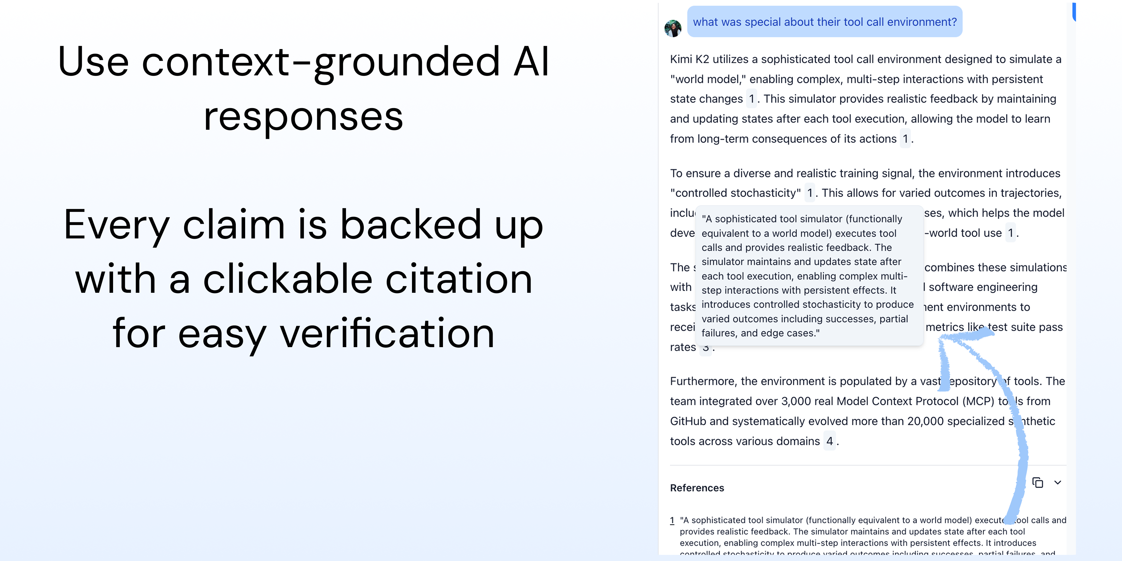 Every AI answer includes precise citations that link back to specific sections in your paper. Click any citation to jump directly to the source material for verification.