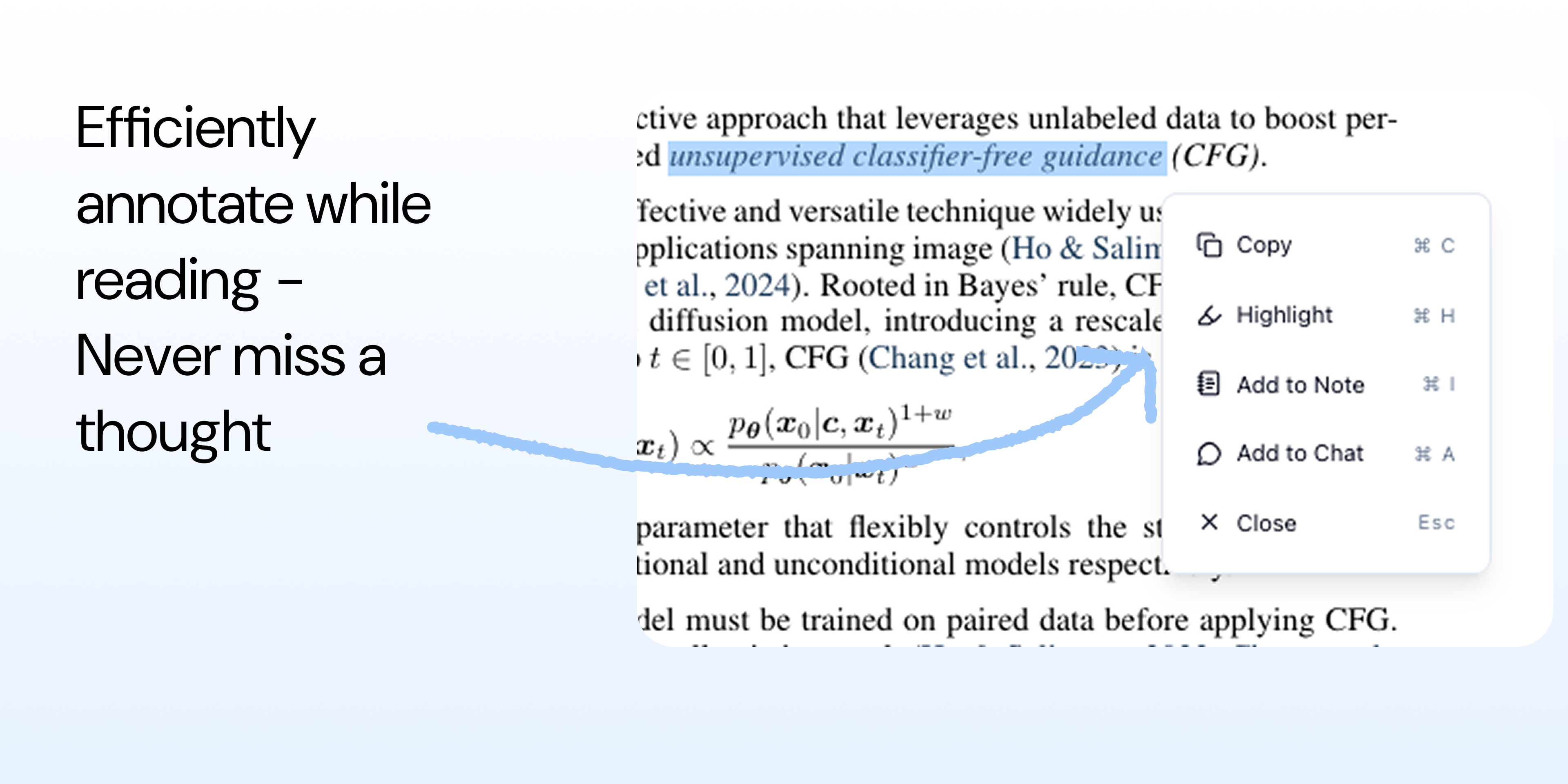 Select text to instantly highlight and add notes. Your annotations sync across devices and integrate with the AI chat for contextual discussions about your highlights.