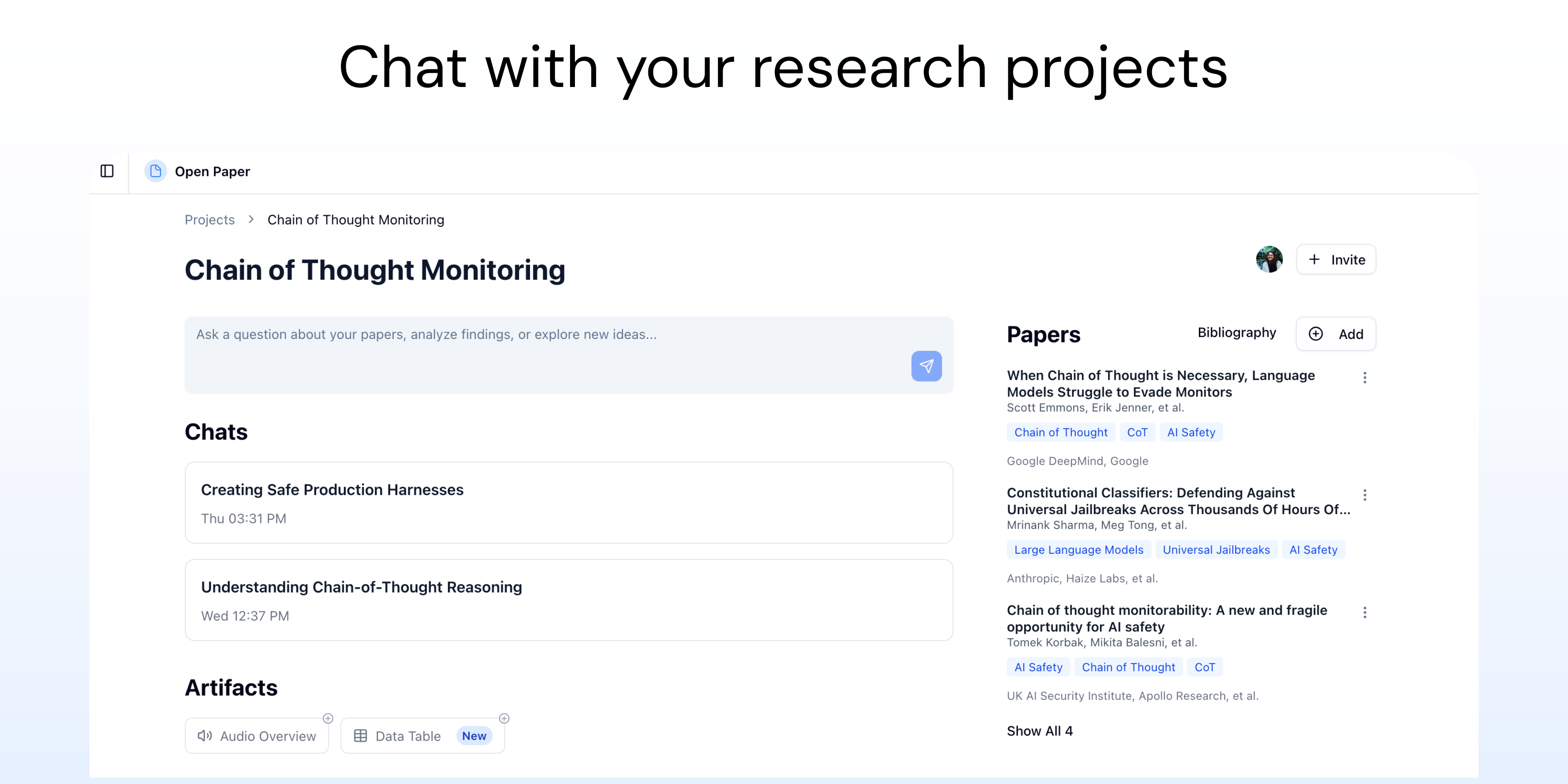 Group related papers into projects and unlock cross-paper insights. Ask questions that span your entire collection, generate artifacts, and maintain verifiable citations throughout.