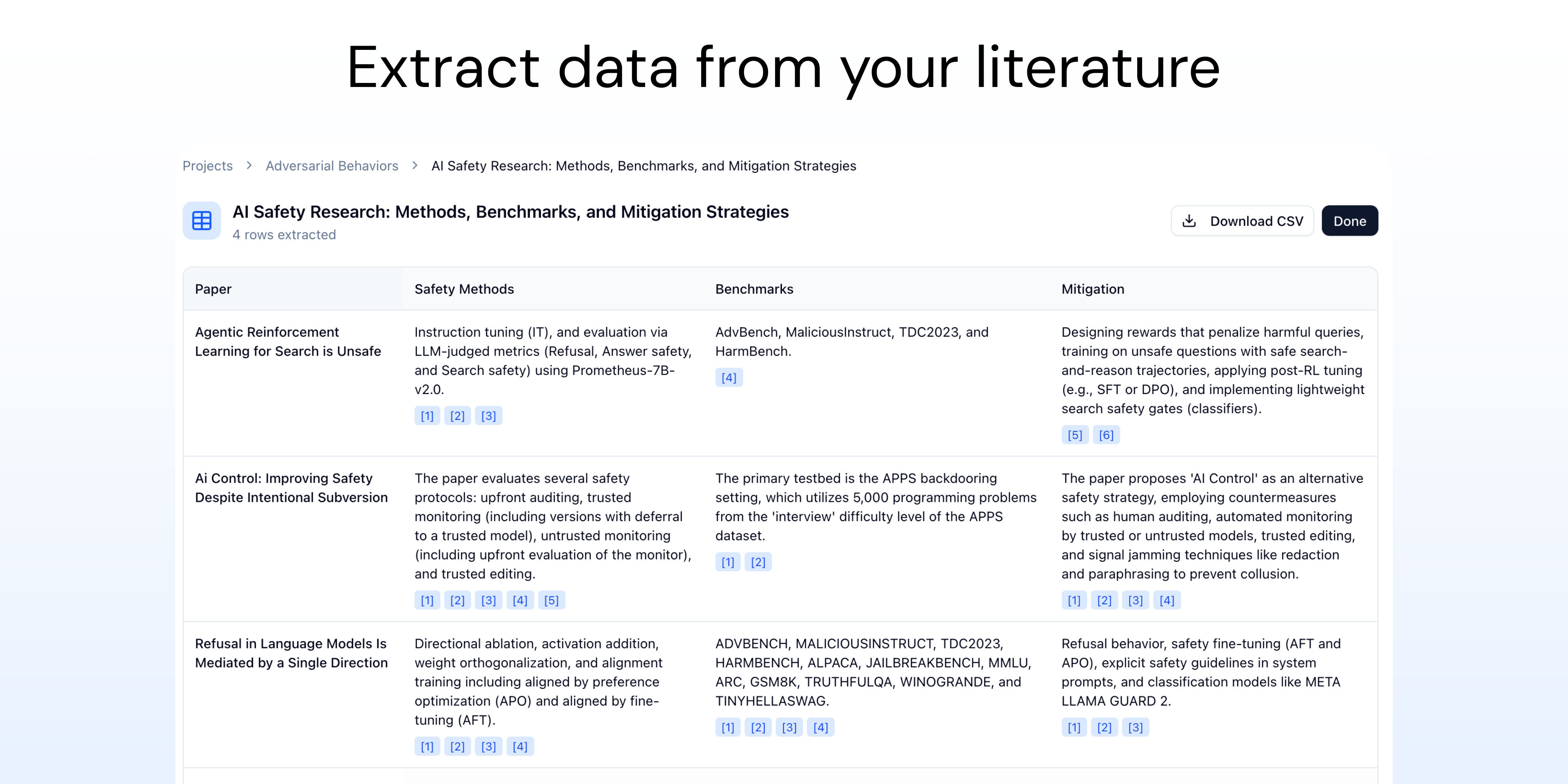 Speed up your literature review with structured extraction. Define custom schemas to pull key fields across your entire project, with every cell grounded in your sources. Export to CSV when you’re ready to analyze.