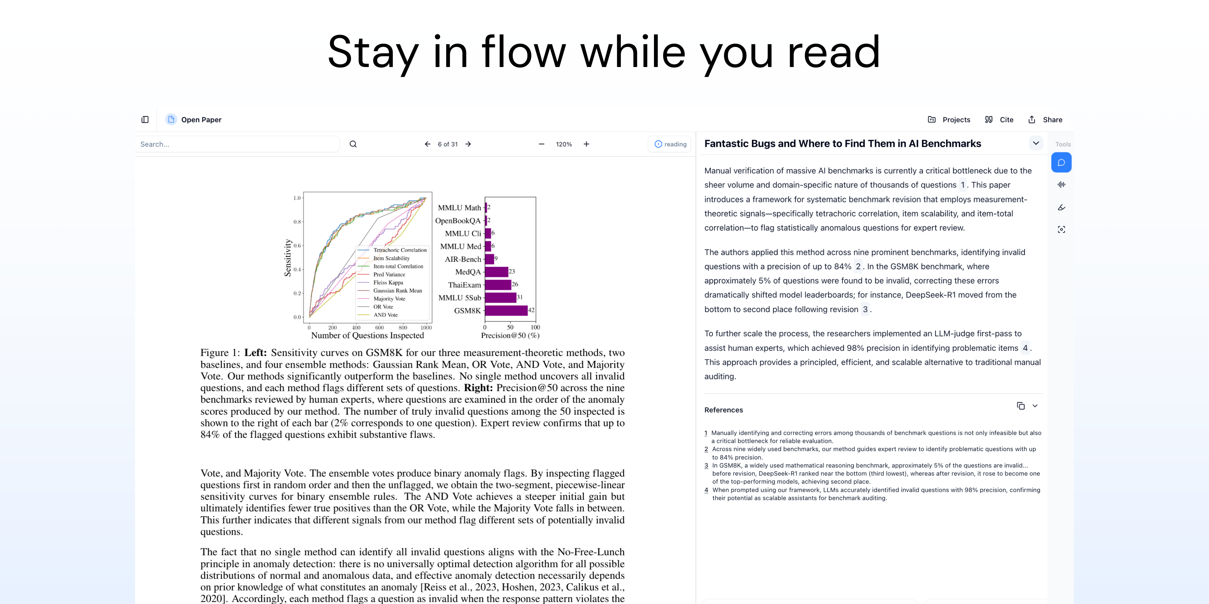 Never lose context while reading. Our split-pane interface keeps your paper and AI chat visible simultaneously, making it easy to ask questions and get instant, cited responses.